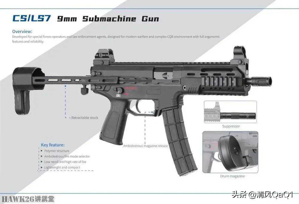 CS/LS7冲锋枪,口径9×19mm。值得注意的是,该枪还可以配备消音器和弹鼓。