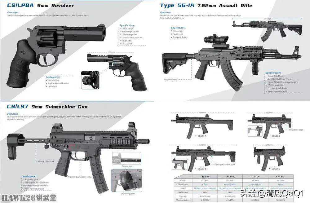 这张图片中还有CS/LP8A转轮手枪和56-1A突击步枪。CS/LP8A转轮手枪口径为.38特种弹,名称却写着9mm,很容易让人产生误解。56-1A突击步枪就是更换枪托和护木的56式冲锋枪,口径7.62×39mm。吐槽一下这个字体,“8”和“B”很难区分。