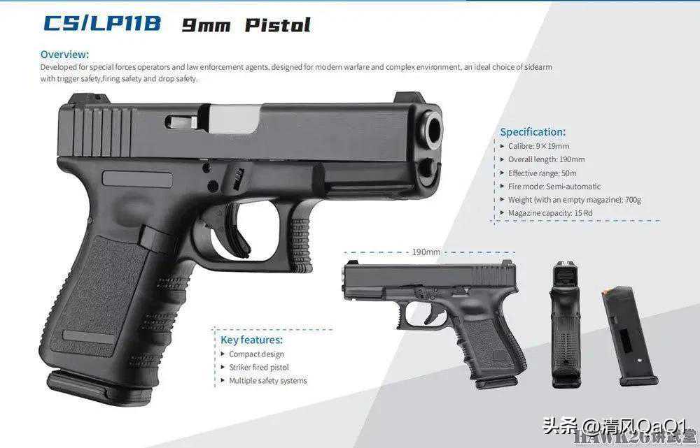 CS/LP11B手枪,口径9×19mm,这就是国内仿制的格洛克紧凑型。从编号上分析,全尺寸型编号为CS/LP11。