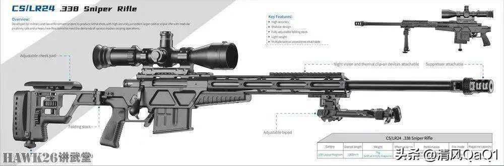 CS/LR24狙击步枪,口径.338拉普阿马格南(8.6×70mm)。空枪重7千克,有效射程1200米,5发弹匣供弹。