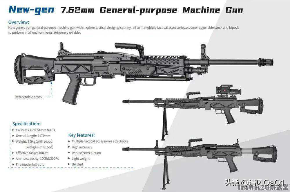 7.62×51mm口径通用机枪,并没有具体型号,只标明是“新一代”。空枪重8.5千克,安装三脚架重14千克,有效射程1000米。