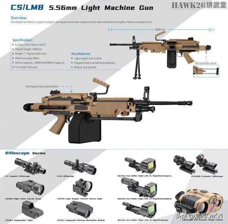 CS/LM8轻机枪,口径5.56×45mm,就是仿制的米尼米伞兵型,但枪管却与标准型相同。除了枪械之外,还有多种瞄准镜和光学设备。