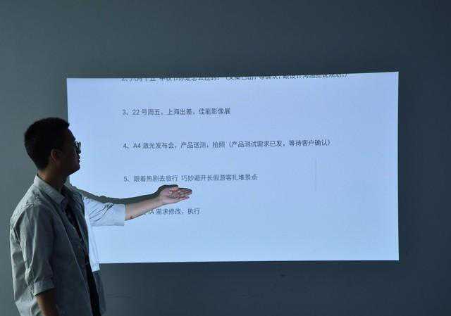 为了让大家更好地了解这款产品的效果,我们特别在会议室的环境下进行了实拍。投射画面尺寸为65英寸,这种画面尺寸适合三五个人的会议。光峰小亮智能商务投影并不是为超大型会议室定制,而日常的办公中,三五人的会议室频次极高,因此光峰小亮智能商务投影的实际用并不弱。
