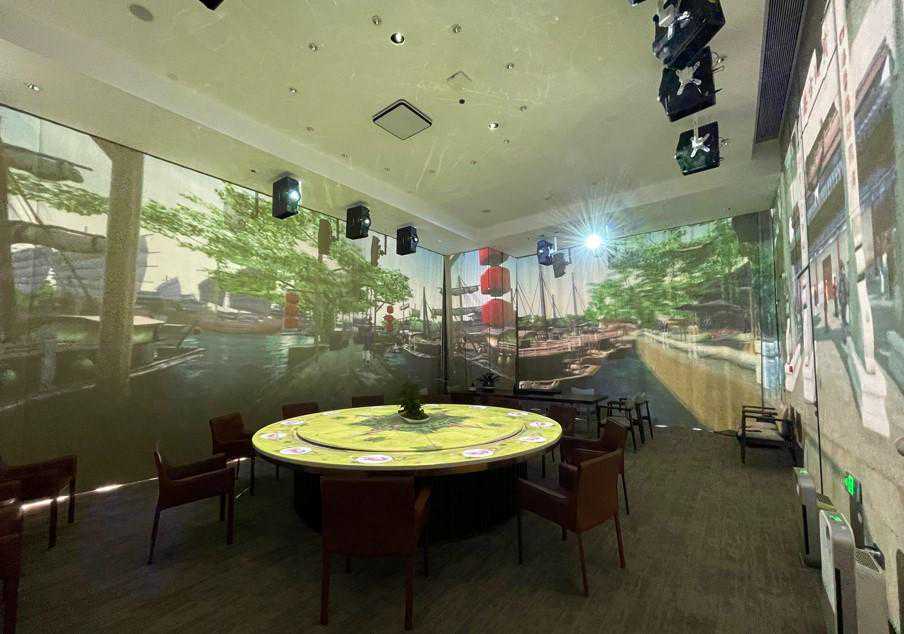广州一家高档餐厅成为中国首家安装科视ChristieInspire系列1DLP激光投影机的场所,以沉浸式投影重新定义美食体验。中清映业集团负责投影机安装和调试,安装在天花板上的全新Inspire系列1DLP科视ChristieDWU760-iS激光投影机展示“海上丝绸之路”3D投影主题风格,客人在享用美食之际,还能欣赏到包间墙面上生动逼真的影片。高清画质、逼真的色彩和多亮度展示带给客人更有代入感、互动性强的新奇消费体验。