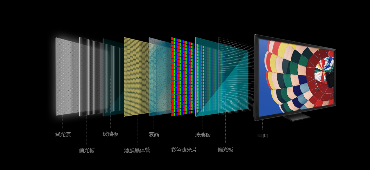 ▲LCD液晶屏幕,是通过电场改变液晶所处的状态,从而调整画面的颜色,再通过LED背光源为画面提供照明,因为其结构复杂,所以屏幕厚度始终难以降下来,而且不可避免的有或多或少的亮度不均匀与漏光情况发生。
