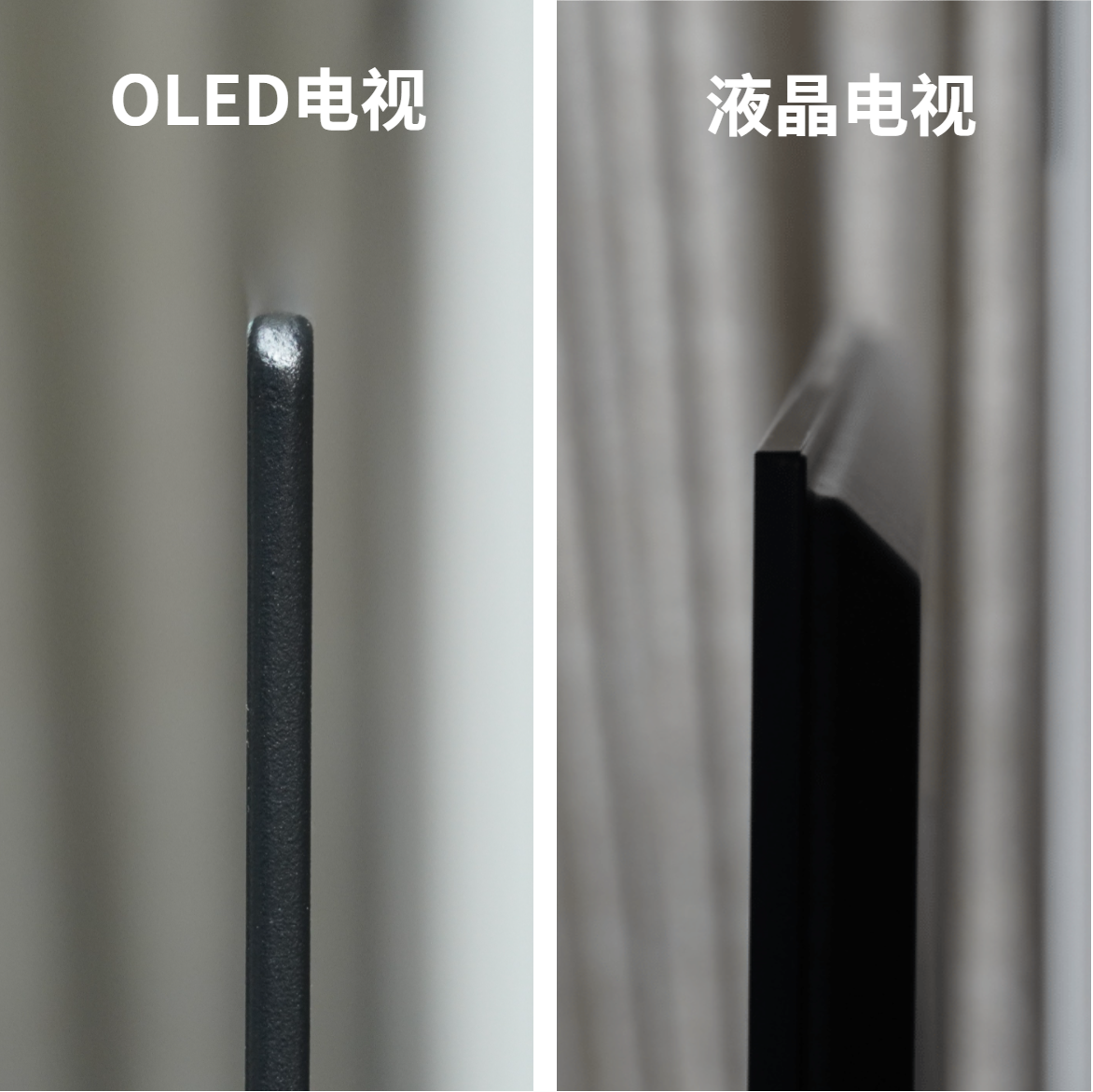 ▲这里放一组实拍对比,即使目前最新款的LCD电视在厚度上依旧要比OLED电视厚很多,由此可见OLED才是未来显示技术的发展趋势。