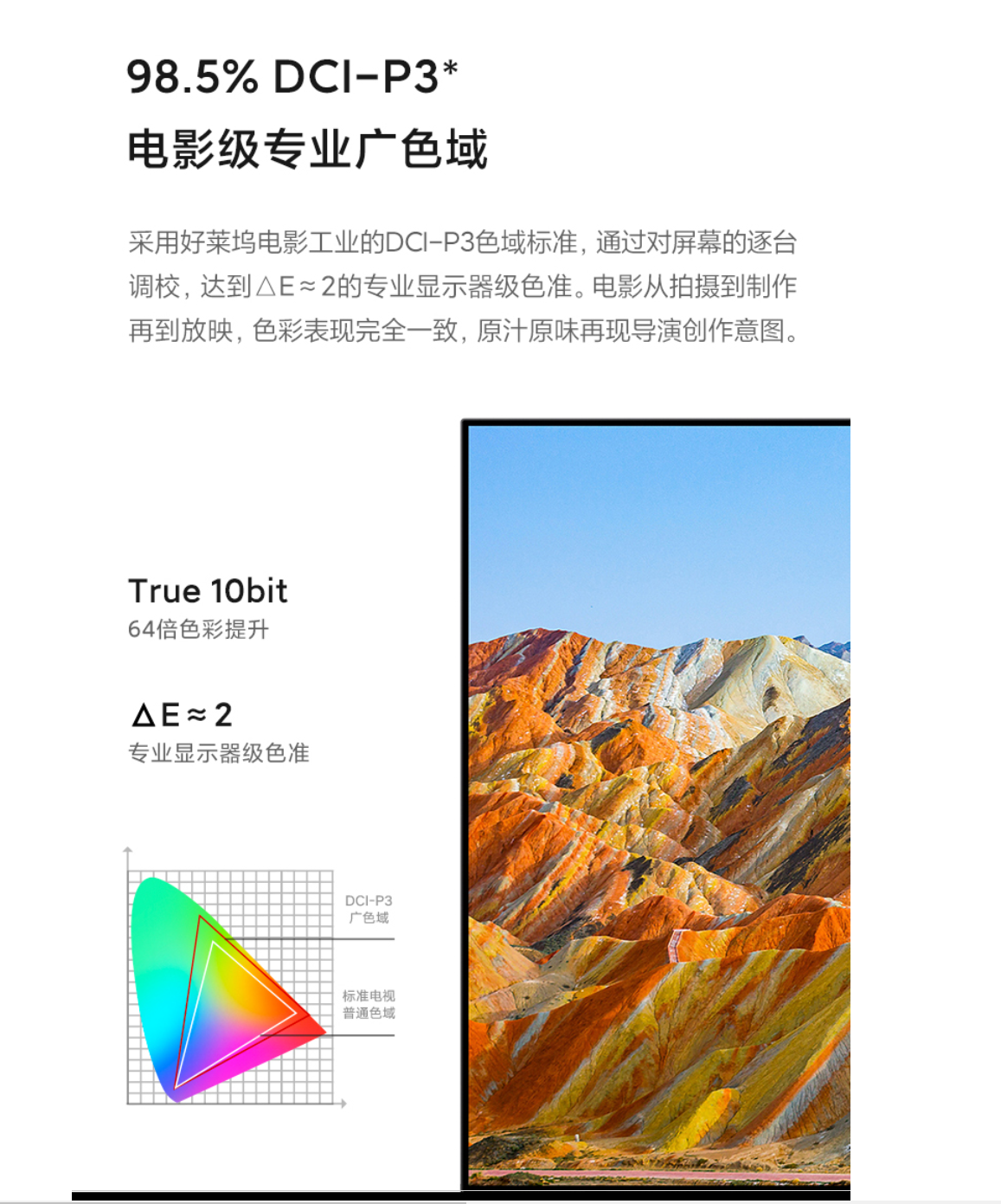 ▲另外,OLED电视相较于液晶电视有着更好的色域覆盖以及色准,小米电视6OLED拥有着98.5%的DCI-P3色域覆盖与Δ≈2的色准。这里简单介绍一下DCI-P3色域,它是一种应用于数字影院的色域,是以人类视觉体验为主导的色域标准,尽可能匹配电影场景中能展现的全部色域,所以DCI-P3色域的覆盖率对于电视来说十分重要。本来想实测一下的,但是校色仪借朋友了,这里就暂时不测了,还请各位见谅。