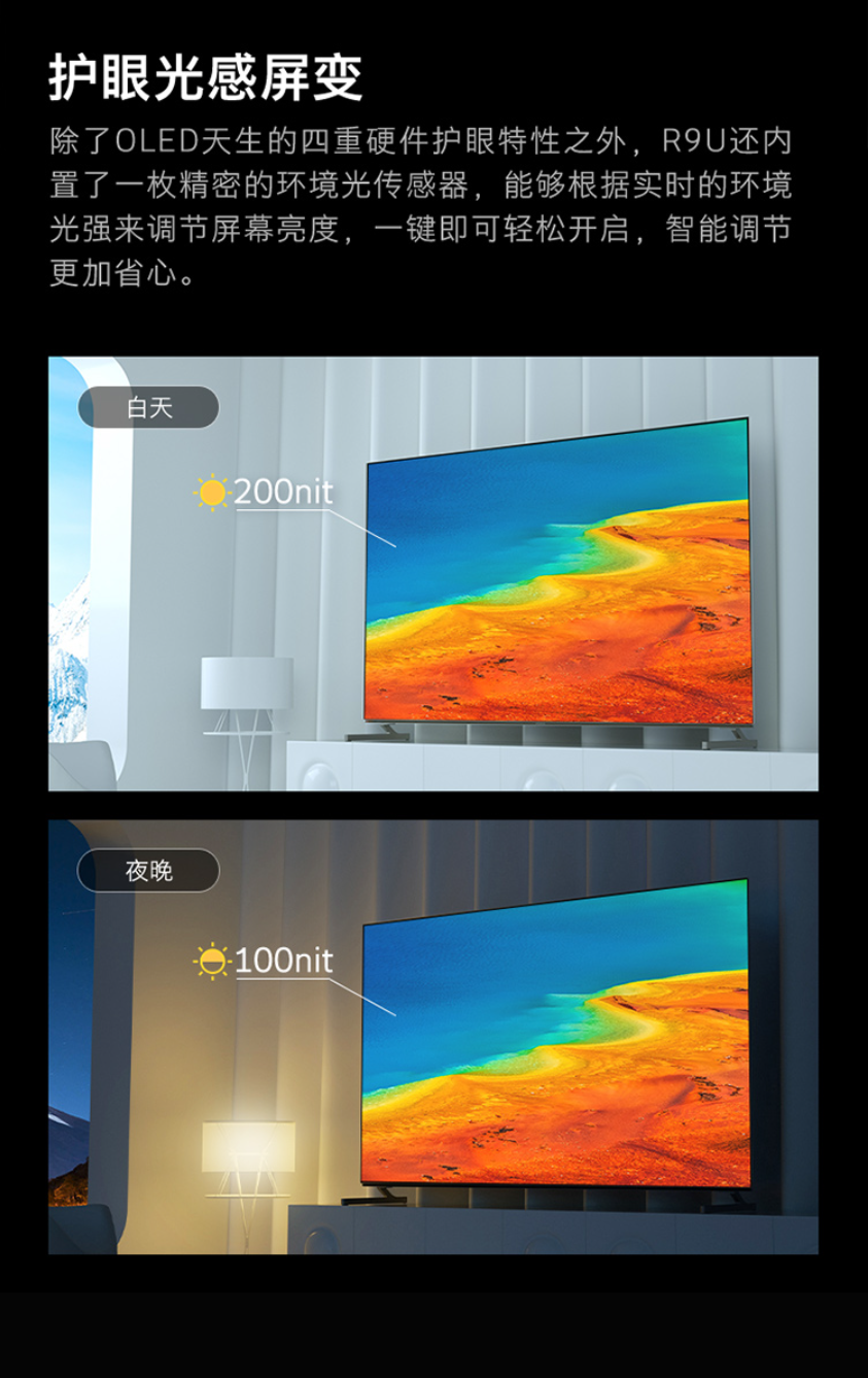▲先重点说一下亮度感应调节,这个技术之前已经应用在高端的显示器上,其原理是机身配置了光照传感器,其芯片通过光照传感器读取当前环境亮度,并通过算法得出最合适的屏幕亮度,在护眼防疲劳方面有着非常不错的效果。这次,创维65R9U将这个技术应用在了电视上,相信同样会有非常好的护眼效果。