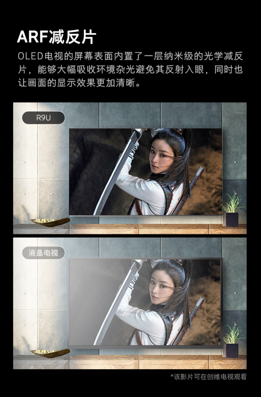 ▲另外,创维65R9U的屏幕上内置了ARF纳米级减少反光片,避免环境光的反射,一方面可以使画面更加清晰,同时也能够更好的保护视力。