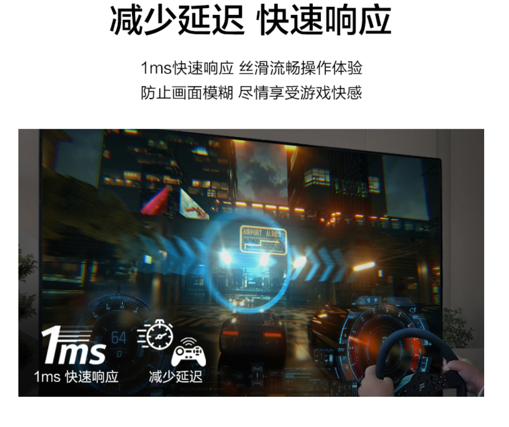 ▲1ms的低延迟更是适合车、枪、球类对响应时间敏感的游戏,游戏体验要比LCD电视好很多。