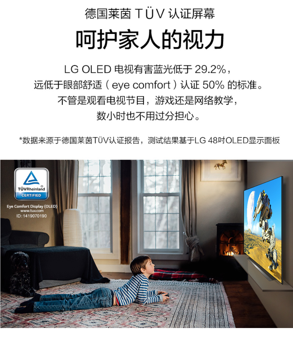 ▲为了保证长时间玩游戏也不容易视觉疲劳,LG48C1通过了德国莱茵TUV认证,相对来说更加护眼。