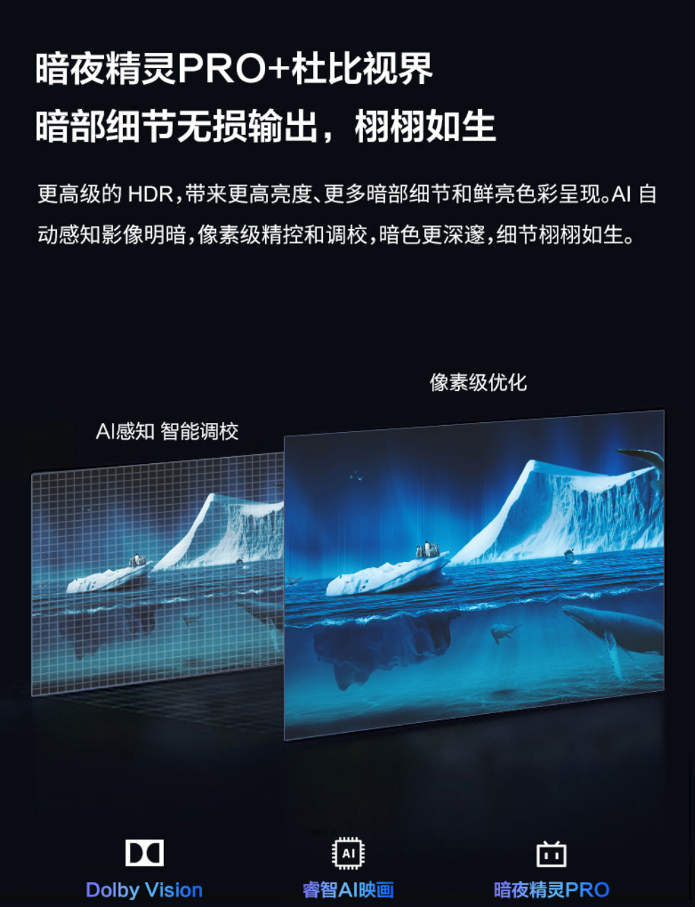 ▲如此高端的电视,杜比视界自然是不能少的,除此之外,睿智AI芯片还会对画面进行像素级的调教,使画面细节更加栩栩如生。