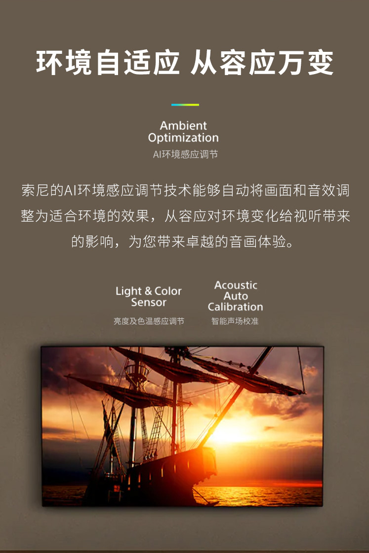 ▲除此之外,索尼的AI环境感应调节还可以智能调教色温、亮度、声场,提供最适合观影空间的客制化播放参数。