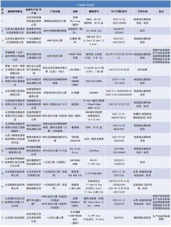 17组批不合格样品标称生产企业、产品名称、型号分别为: