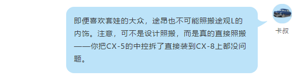 注意,这与“基于CX-5开发”,或者是“放大版的CX-5”是有本质区别的,其开发成本要比这两种情况低得多。