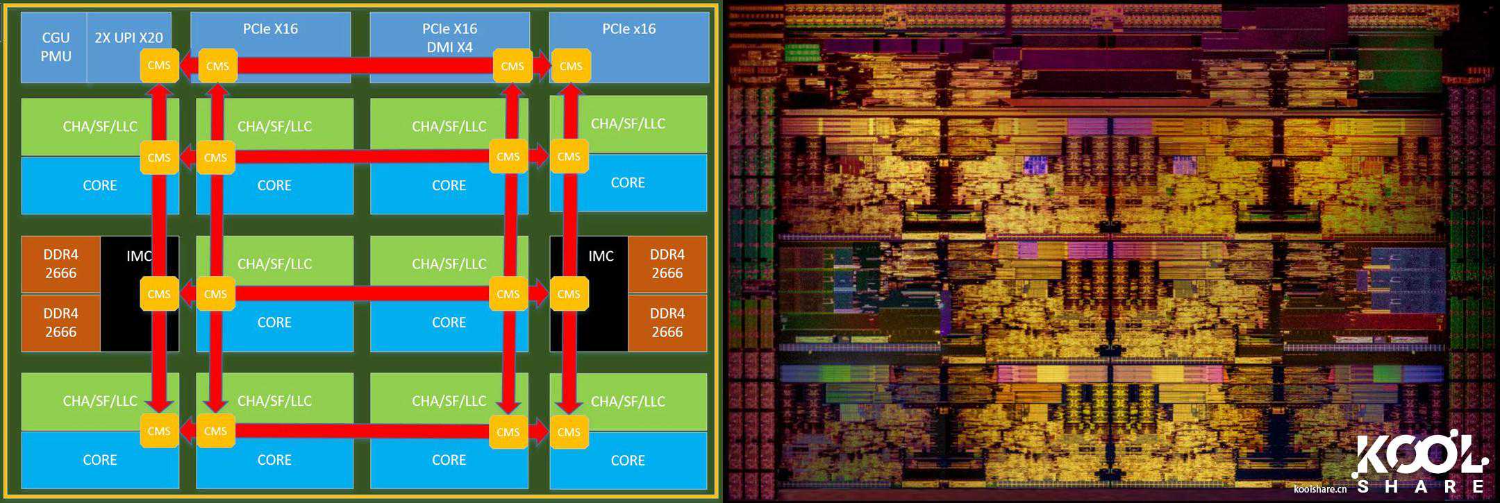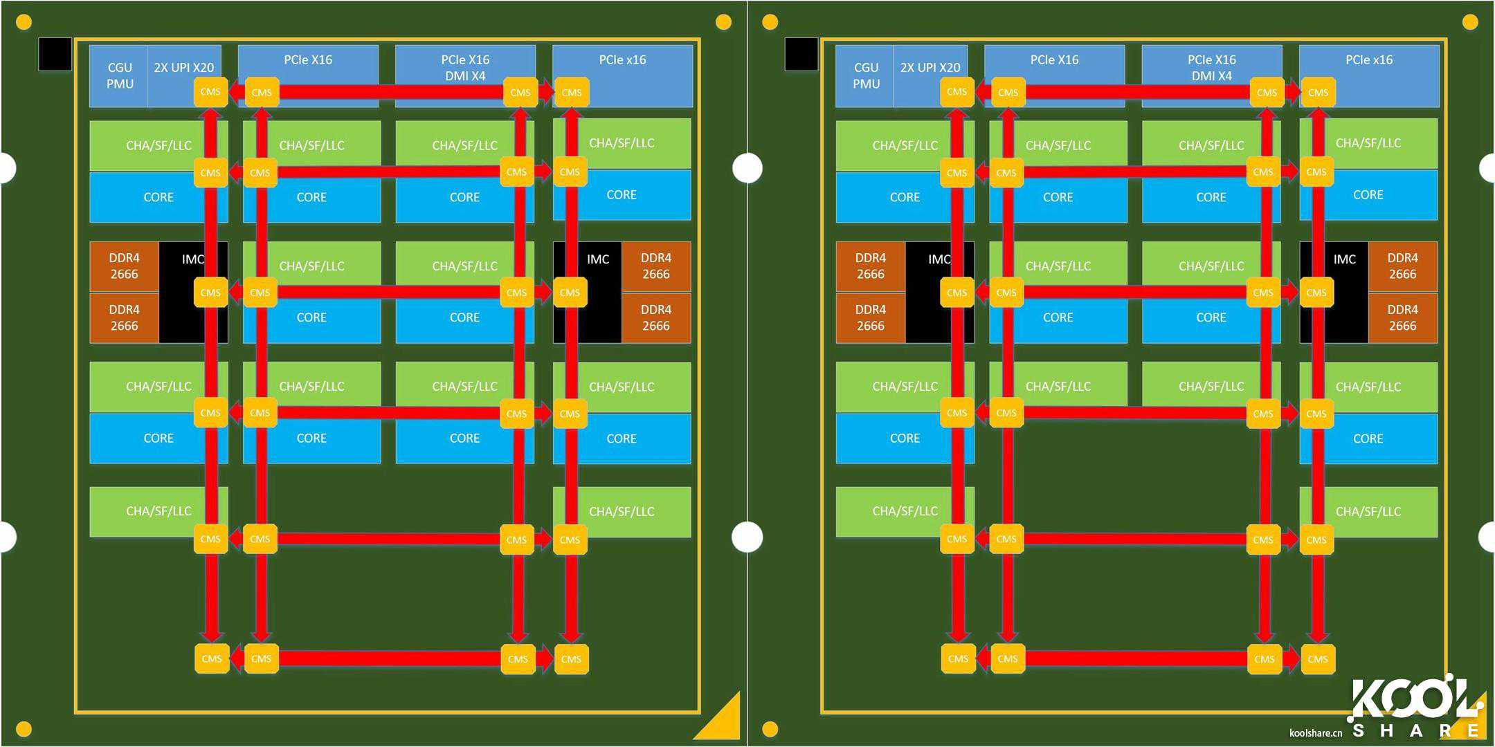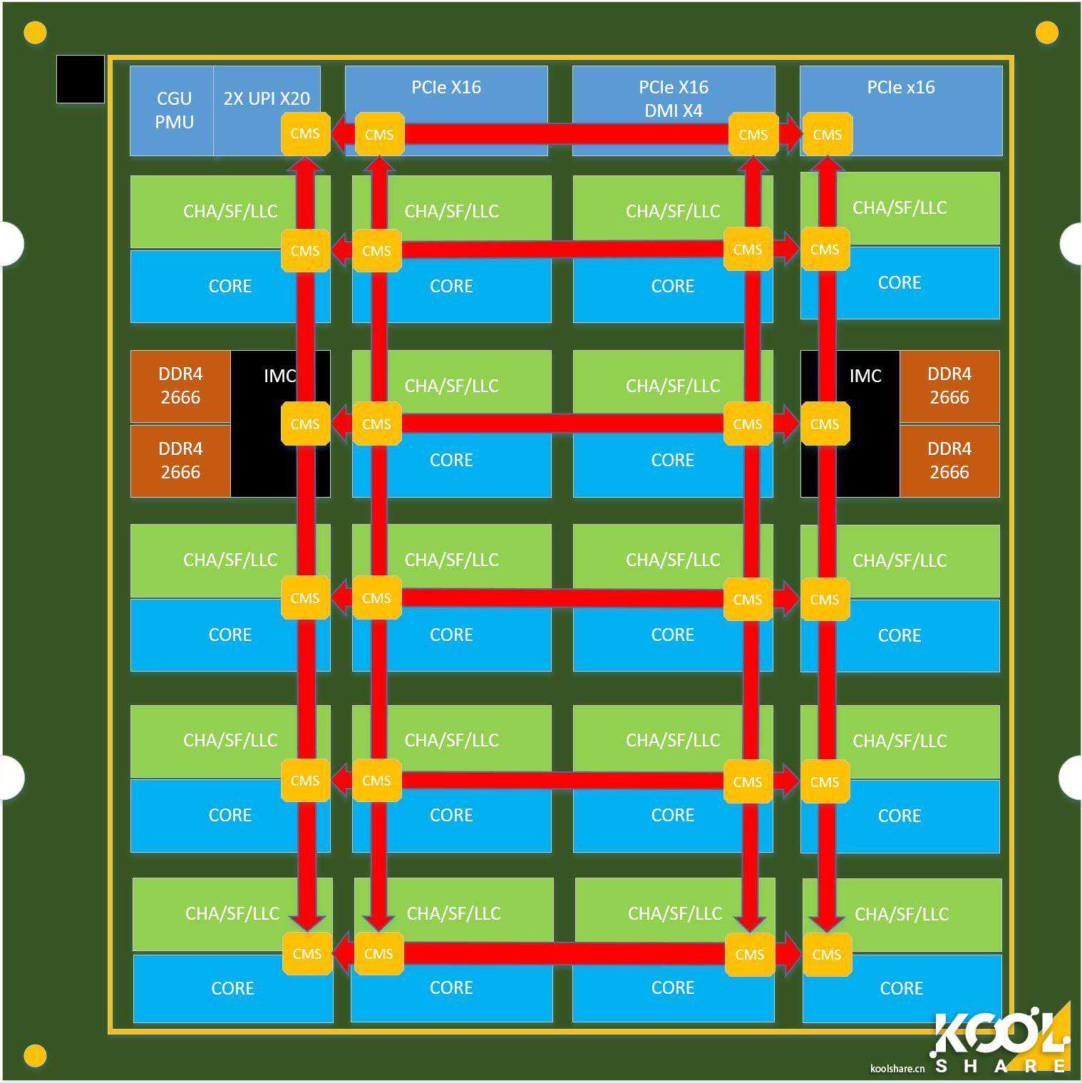 Skylake-X中实现的网状结构mesh完全解决了这个问题。网格由沿垂直和水平方向的半环的二维阵列组成,这允许通信以最短的路径到达正确的节点。新的网状结构实现了路由资源的模块化设计,以消除各种瓶颈。而连接mesh各个节点的单元是CMS,如下图所示,Skylake-X在核心CORE/缓存LLC、UltraPathInterconnect(UPI)节点控制器、PCIe控制器和IMC内存控制器上都设有CMS,来完成mesh的网状结构连接。