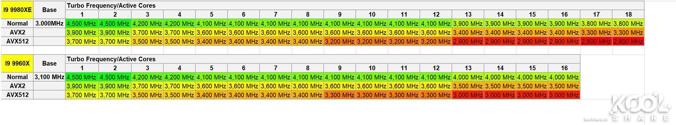 使用HWINFO得到的数据,我将I99980XE和I99960X的三种主频做了一番对比,如下所示: