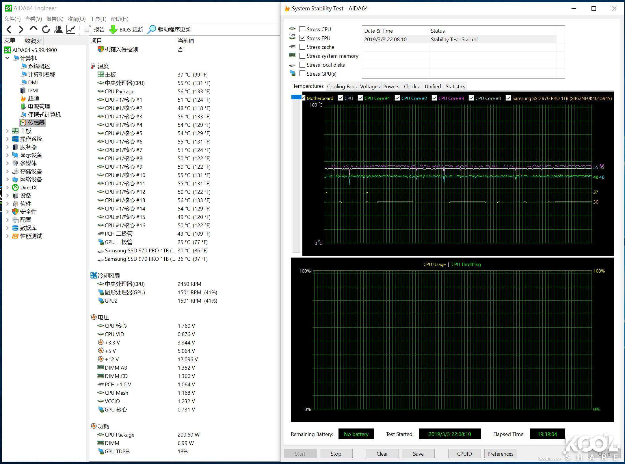 19小时37分钟,CPU满载不降频稳定在55度附近,这是一个极其令我有安全感的数字,虽然CoolerMasterM240R也并不是什么神级的水冷产品,但是在这颗CPU上面呈现出的压制力是绰绰有余!