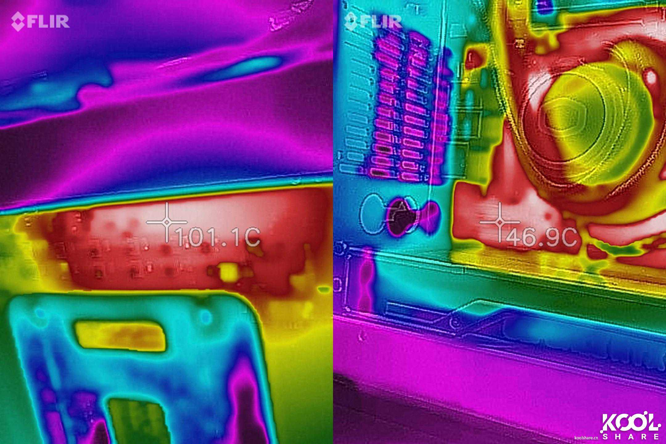 而整个主板最热的部分还不是在正面的供电,而是背面供电部分的VCCIO,最高在101.1度,毕竟这部分没有主被动散热。X299PCH散热片的最高温度在46.9度附近。
