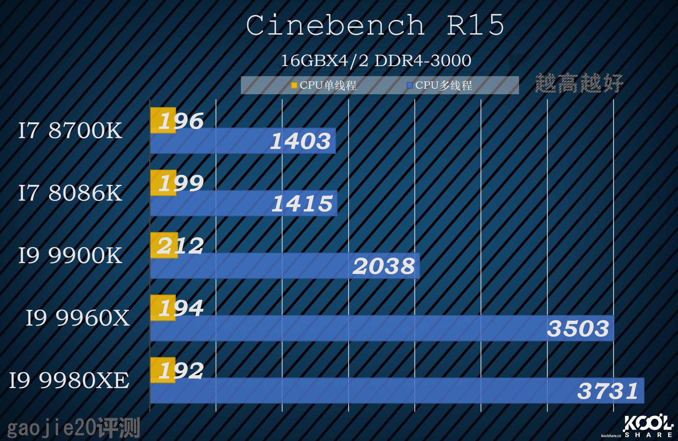 这个测试部分没有太多的意外,单线程I99900K是最强的,I99960X也确实在单线程中以微弱的优势胜出I99980XE,这和主频差是相符合的。如果是普通应用加游戏的话,I99900K是不二选择!