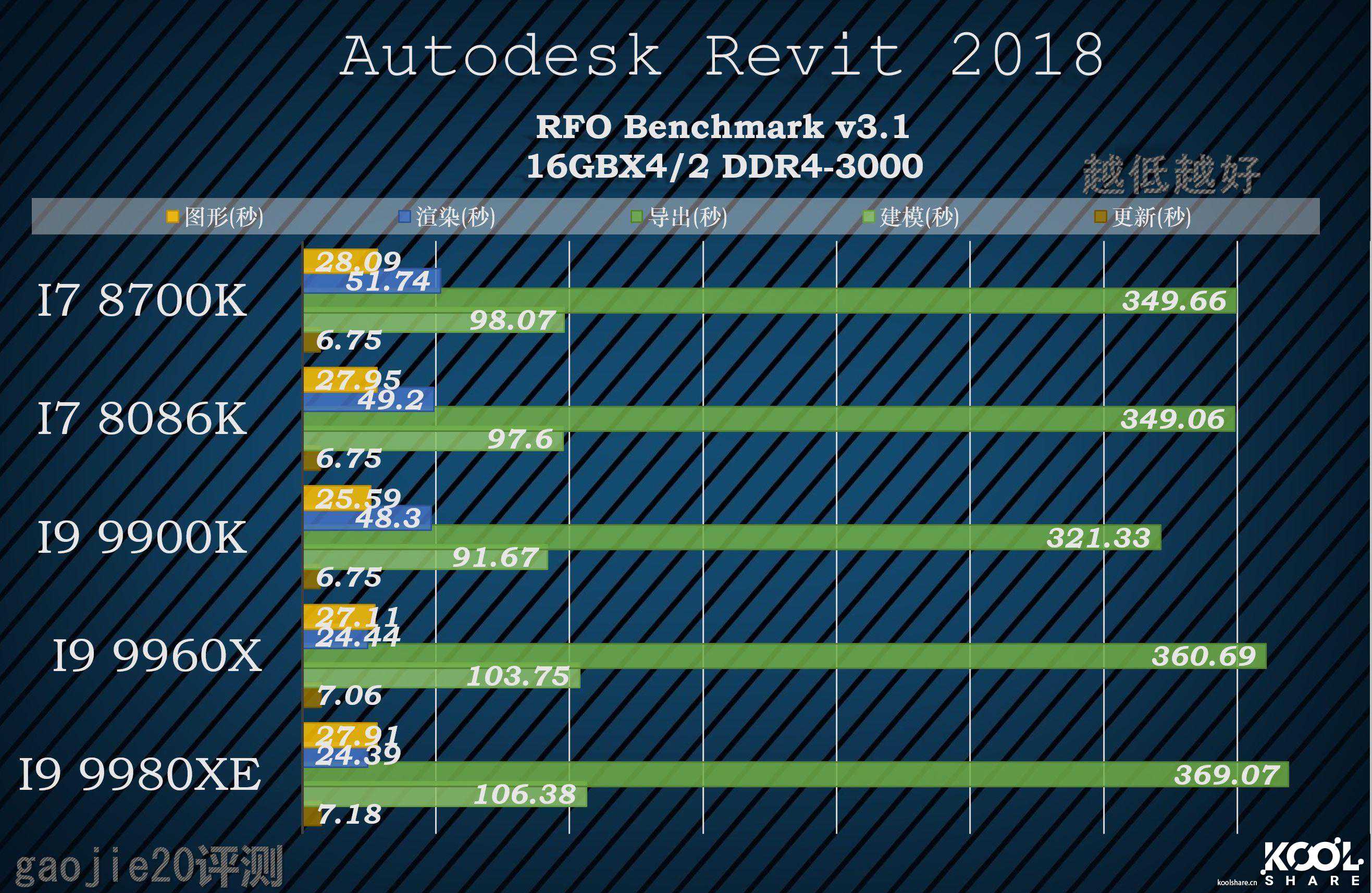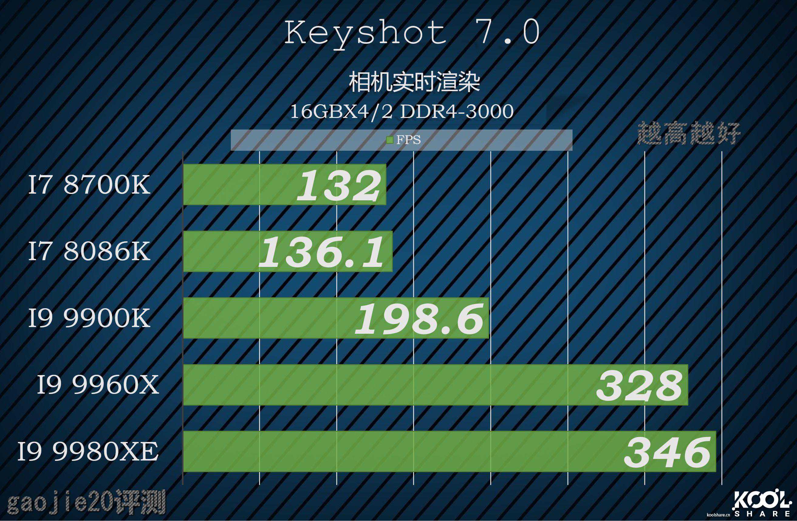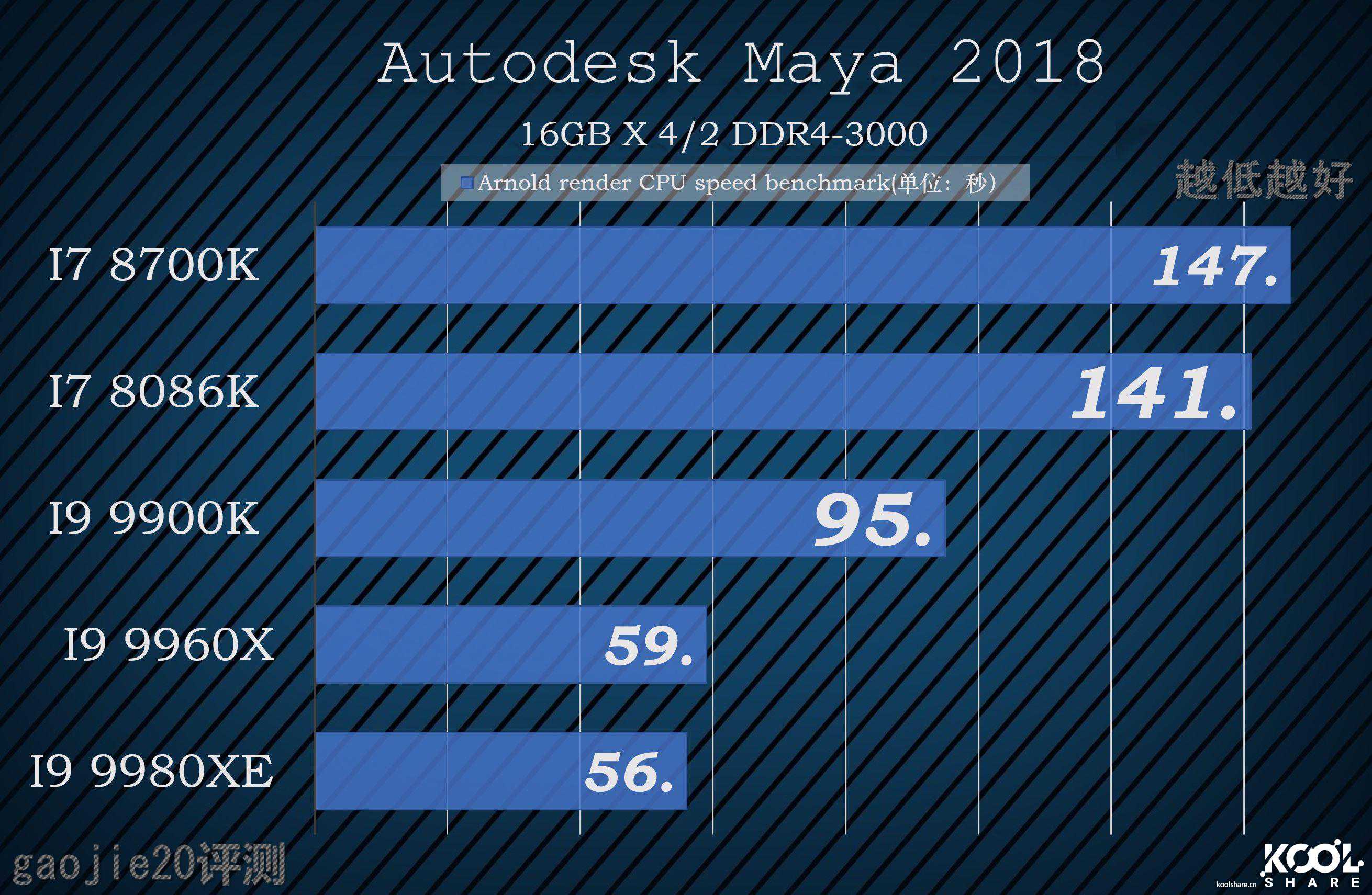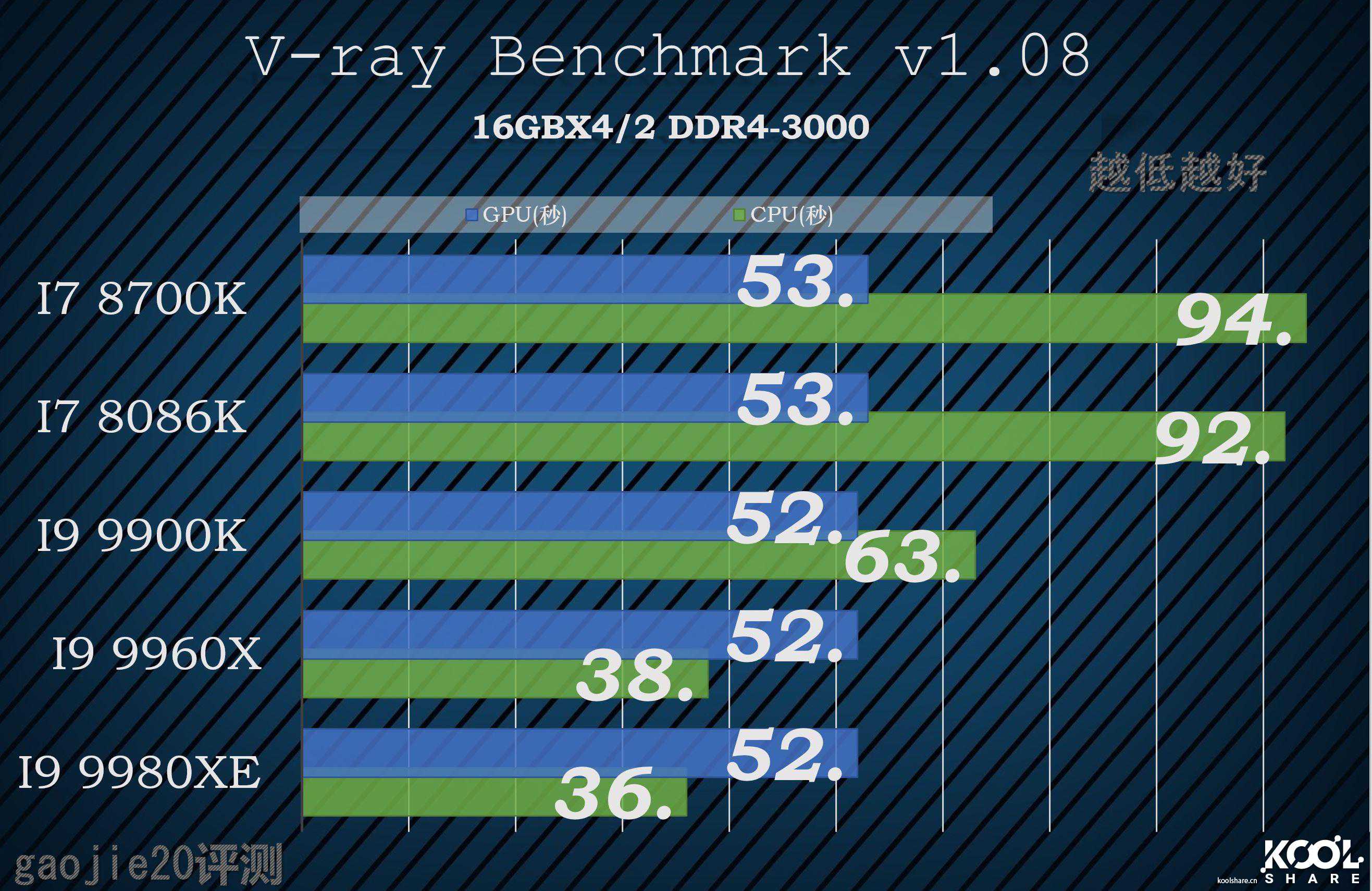 在V-RAY里的测试结果完全符合主频差+核心差的量化结果,I99960X在和I99980XE的对决中几乎第一次用主频差拉平了核心差。