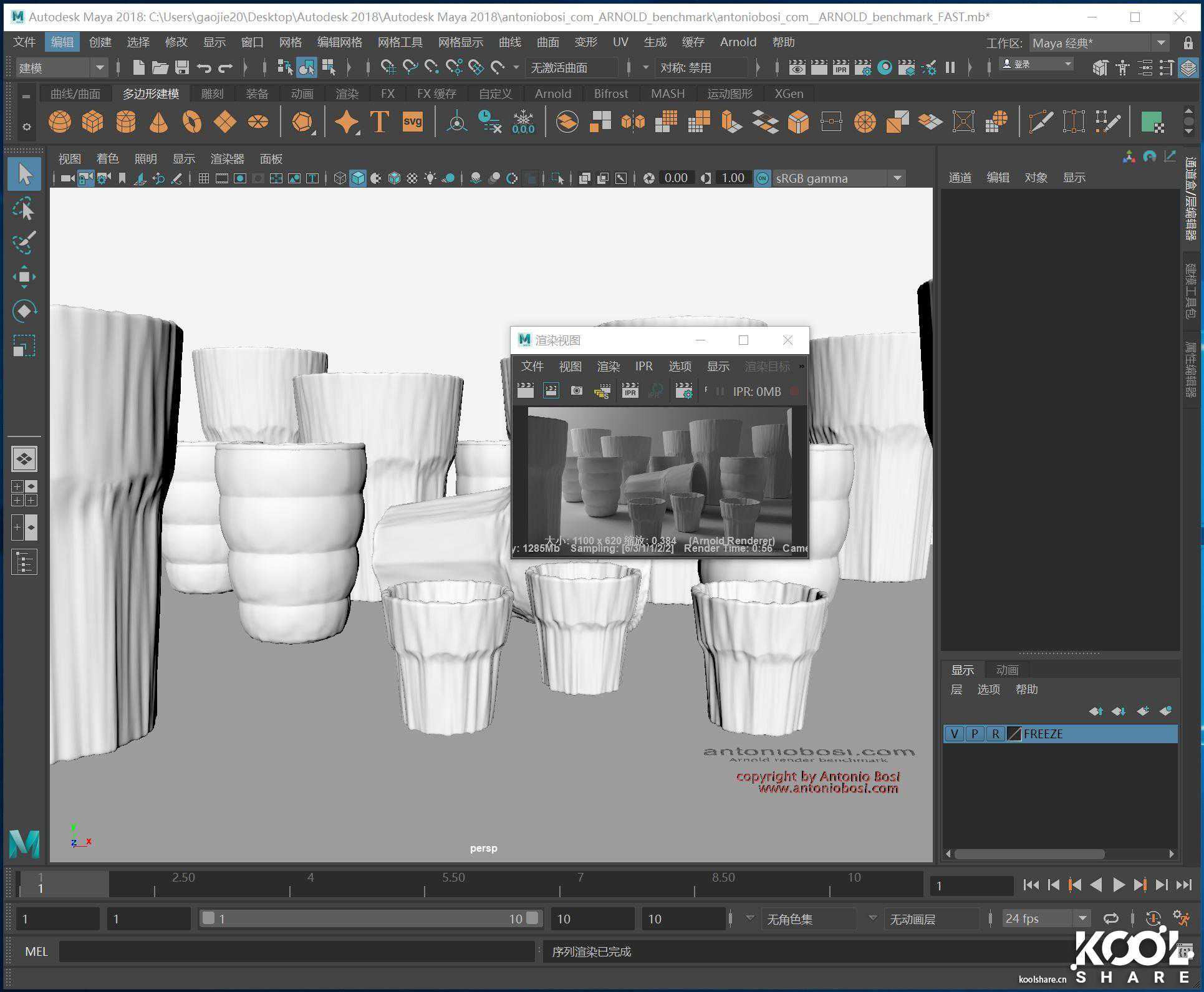 是一个测试你的CPU渲染速度的Arnold渲染基准!这是一个非常简单的Maya渲染场景,两种测试模式,关于速度的快速测试和关于稳定性的慢速测试,我使用快速测试,查看底部的结果来比较CPU速度。