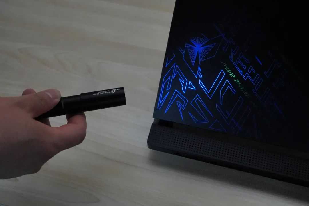 首先聊聊最凸显整机气质的A面设计。粗略地看,你会觉得枪神6Plus超竞版和ROG家族的其他游戏本似乎也没啥太大区别,通体黑色,大眼睛ROG可发光LOGO很有辨识度,整体是偏稳重的风格。而仔细观察之下,你就会发现该机的A面的斜切式分割藏有彩蛋:在LOGO另一侧绘有幻彩隐形油墨图案,常规光照环境下它处于“隐形状态”,当你用随机附赠的UV灯照射上去,幻彩花纹就显现除了色彩斑斓的效果,很有科技感。