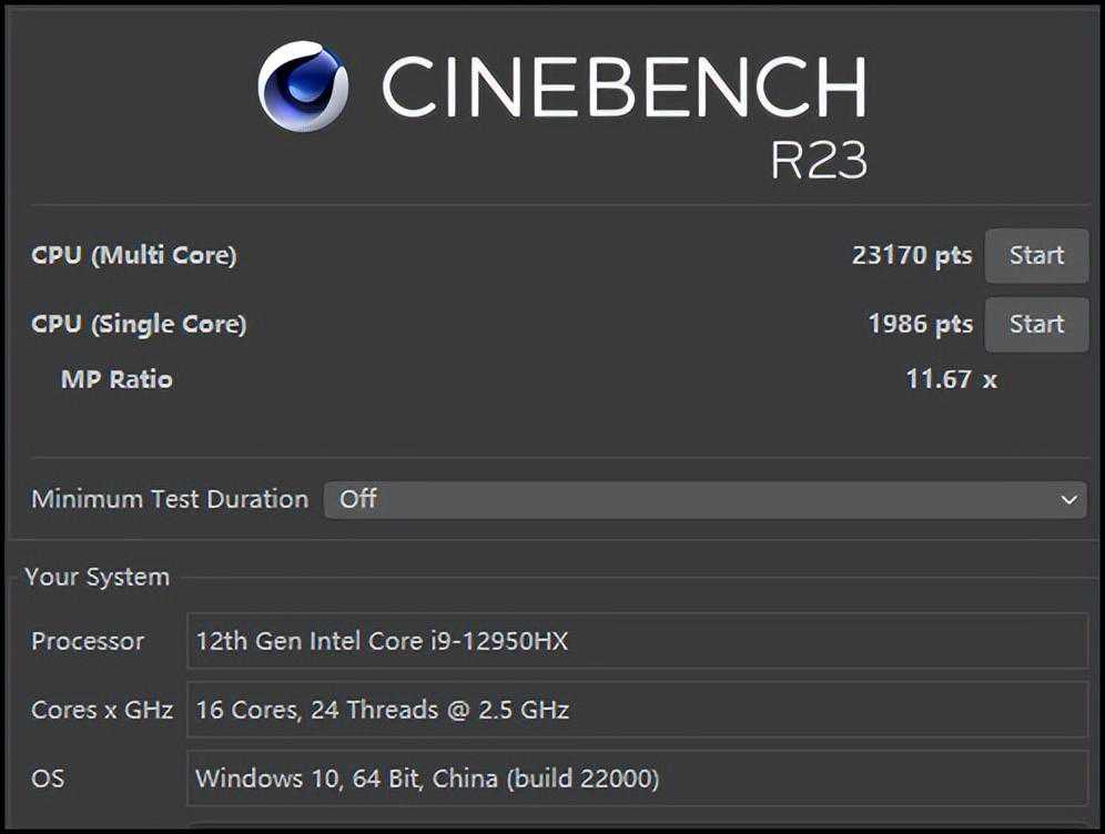 ▲CineBenchR23测试,枪神6Plus超竞版i912950HX的多核测试拿到了23170pts的高分,相比之下,110W款i911980HK为15152pts,比上代猛机提升了约53%,95W的i912900H为18041pts,超出幅度约27%。同时,单核1986pts也非常亮眼。