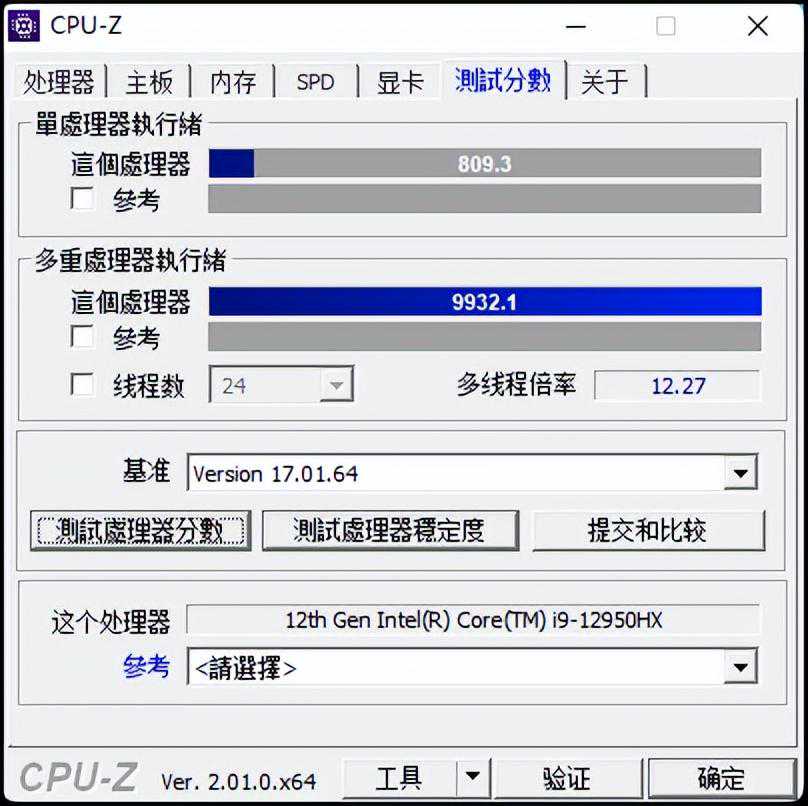 ▲CPU-Z测试,枪神6Plus超竞版i912950HX的多核为9932,差一点破万,单核突破800来到了809。同样的,作为对比,110W款i911980HK为6453,提升幅度约为54%,95W的i912900H为8274。