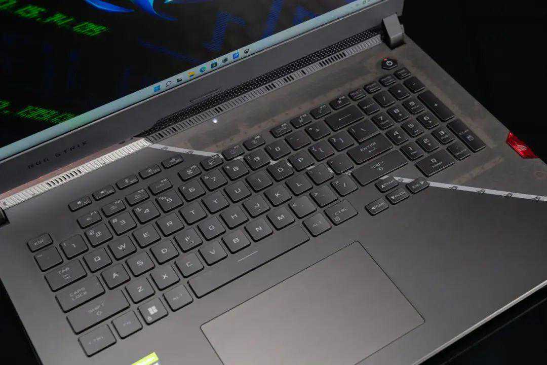 键盘区域的视觉效果更显创意与潮流:依然是一条斜切线将C面分成两个区域,右侧区域为笔记本上罕见的半透明设计,你可以透过它一览机身内部的轮廓。这个设计不仅让该机区别于其他普通笔记本,更有一种工业线条的美感,还凸显出了ROG强大的设计实力。