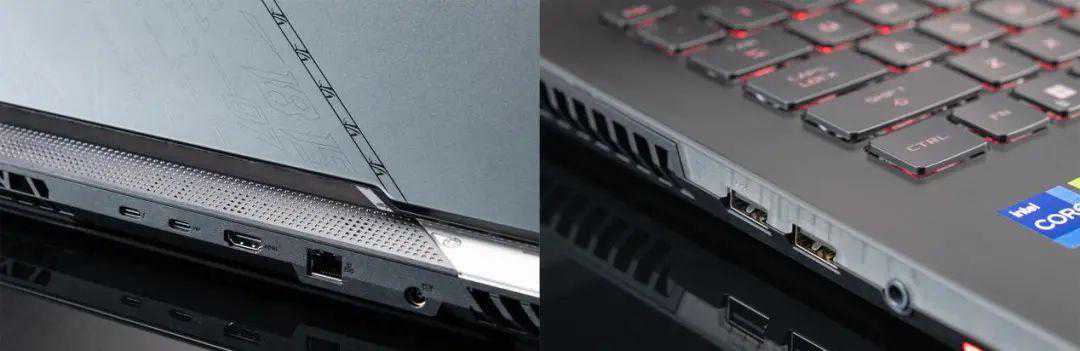 接口方面,枪神6Plus超竞版机身左侧有两个USB大口,尾部有两个Type-C口(一个是雷电4,一个是全功能口),一个口以及一个RJ45有线网口,机身右侧是一个钥石插槽。扩展性强大,种类也丰富。但有一点在牛叔看来可以优化,比如把一个Type-C口移到机身侧面来,这样外接C口设备时会更方便一些。