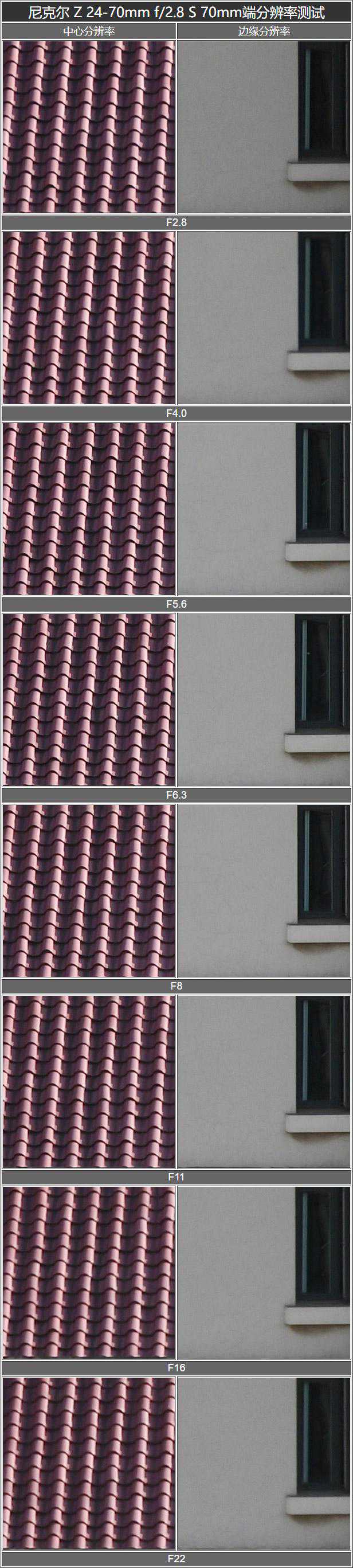 看完24mm广角端的分辨率后,我们再来看看70mm长焦端的分辨率。测试方法同24mm广角端一样。