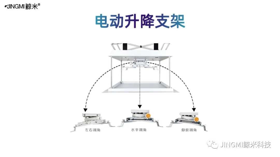 电动上升支架,安装方法与以上大致相同,原理是可以将投影仪在不用的情况下隐藏,使用时再次降下来即可,预定位置可以设置,可实现自动下降,能完美配合幕布的位置,不会因为每次使用而重新调试位置。