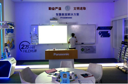 此外,Panasonic投影机20,000小时持久光源HLD系列的超短焦投影机PT-SGW400C配合电子白板、音响、电脑等教学工具,完美模拟了课堂教学实景,大大满足老师的日常教学需求。