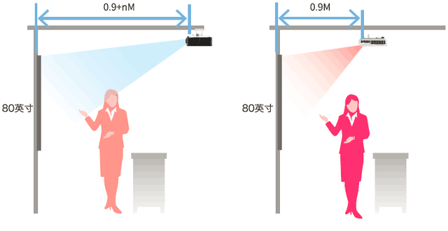 普通投影机投影(左)和理光教育短焦投影机PJWX100ST投影(右)
