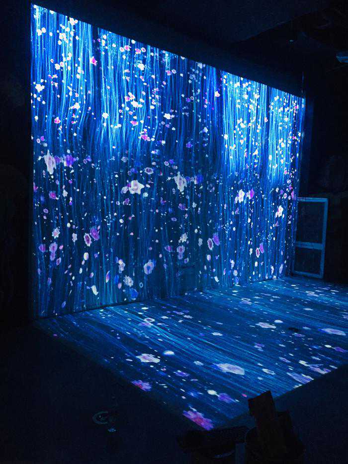 “流光瀑布”体验区,由6台NECCK4155X分别投射墙面和地面,如水流般的光束自上往下流淌,当游客触摸画面时桃花花瓣便随动作飞出,宛若美轮美奂的繁花瀑布,带给游客流光溢彩的光影艺术享受。
