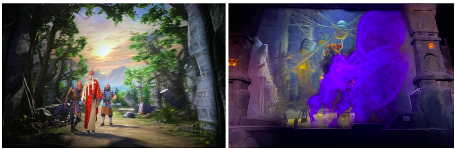 除了“三打白骨精”以外,科视领先的激光投影、内容管理和处理解决方案还被部署在“勇闯盘丝洞”和“智取芭蕉扇”这两项游乐项目中。赢康科技负责为“勇闯盘丝洞”中的黑暗骑乘项目安装了39台DWU850-GS和4台DWU630-GS激光投影机,投射到5个大型曲面屏。“智取芭蕉扇”中的惊艳画面则是通过11台HS和GS系列激光投影机以及科视潘多拉魔盒播放器和管理器来共同完成,这是由科视另一个合作伙伴——上海合昊科技有限公司——负责安装和调试。