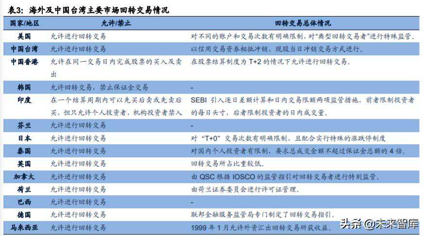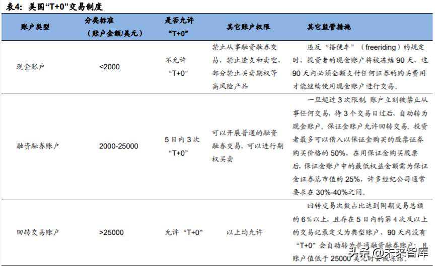 与国内A股市场实施T+1交易制度形成对比,海外主要证券市场均采用T+0的交易制度,但各证券市场并非完全放开股票买卖的限制,而是按照本土市场的情况,设置了一定的监管措施,从而在一定程度上保护了中小投资者的权益。例如:美国市场依据账户金额和账户性质决定交易制度;日本仅允许每只股票当日“T+0”内回转交易一次且配合实行特殊的涨跌停制度;中国台湾分别以信用账户资券相抵冲销和现股当日冲销交易来实现“T+0”,并通过保证金制度、回转交易额度控制制度和证券公司损益评估制度对于“T+0”加以限制。