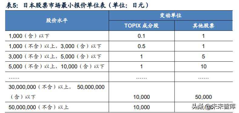 东京证券交易所规定,投资者在发出限价委托时,最小报价单位随着股票价格和股票流动性的变化而变化,其设计原则为股票价格越高,最小报价单位越高;流动性较高的TOPIX100成分股,为求最佳成交价格及缓和撮合过度集中等情况,则采用更小的价位,具体见下表。