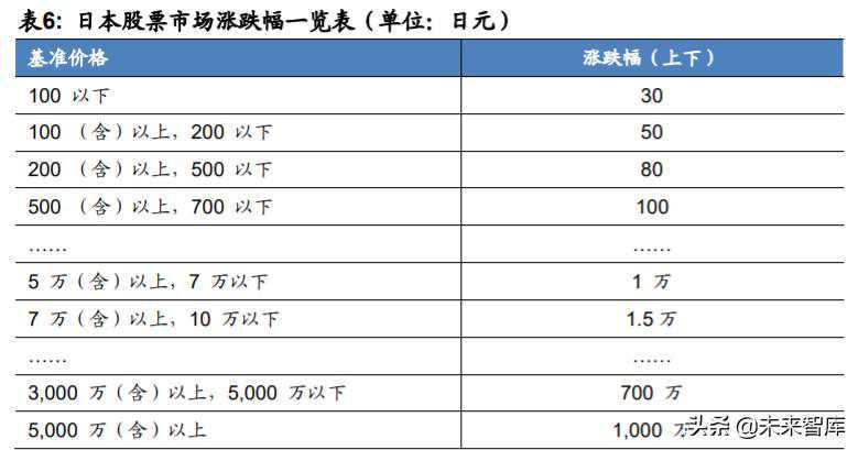 日本股票市场同样存在涨跌幅限制,原则上以上一交易日的收盘价为基准,根据股价的水平进行差异化设定,具体见下表。