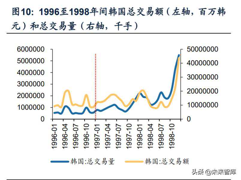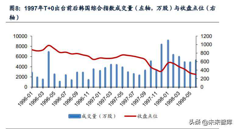 从成交量和收盘点位来看,恢复T+0交易制度后,韩国综合指数在半年内先降后升,成交量在最先三个月内逐渐上升,于1997年4月达到峰值,总计4365.8万股。