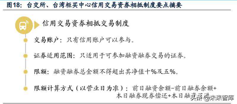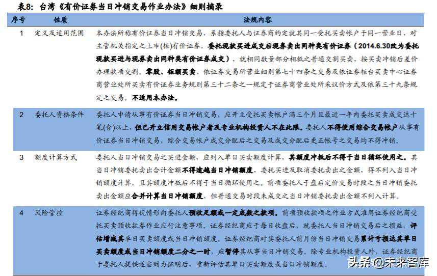 1993年12月28日,台湾证券交易所公布《信用交易资券相抵交割之交易作业要点》,正式恢复T+0制度。随后,2005年11月2日,台湾柜买中心发布《上柜股票信用交易资券相抵交割之交易作业要点》,同样恢复T+0。两部法规细则大同小异,都从交易账户、证券种类、限额等方面作出限制,体现出监管层对T+0制度实施的谨慎。两部法规要点摘要如下: