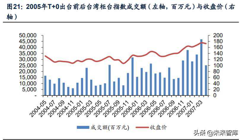 从波动率来看,三次制度的设立与完善都没有对市场稳定造成显著冲击,台湾加权指数与台湾柜台指数波动率均呈平稳态势,表明在监管到位的前提下,T+0制度将在保证稳定性的基础上活跃市场交易。