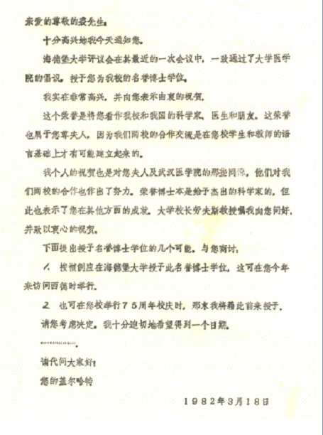 1982年,海德堡大学友人来信告知学校授予裘法祖名誉博士的决定并肯定裘罗懿为两校合作交流所做的贡献