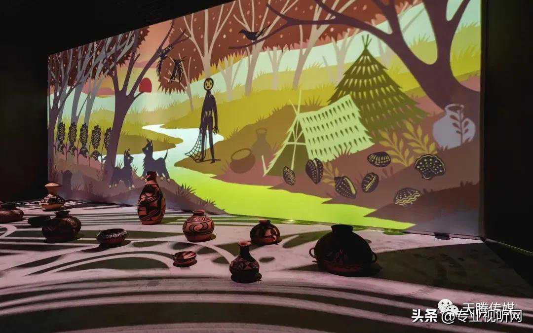 《图腾密码》展项采用6台Vivitek(丽讯)RU70983工程投影机,独创写意的远古动画影像从墙面覆盖至地面,生动还原5000年前的上古生活场景。而在场景之中,放置着形态各异的大小彩陶瓶,最为瞩目的当属人头型器口彩陶瓶,以人头像及抽象的线条结合,诗意的诠释中华文明最为古老的彩陶文化。