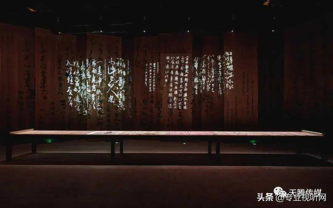 《万岁通天帖》作为唯一接近书圣王羲之真迹的书法珍品,有着极其珍贵的文献研究价值。展项内共使用2台Vivitek(丽讯)RU70983和6台DH3660Z工程投影机打造而成,空间纱幕呈现动态书写的书信文字,中间区域的条形长案同样以影像与之呼应,使观众在欣赏大师真迹的同时,也能感受作品背后的奇闻异事,体会中华传统书画艺术的独特魅力。