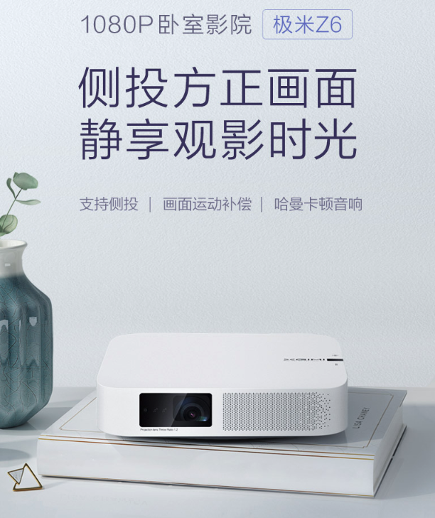 然后就是极米Z6无屏电视同样是1080P分辨率,但是极米Z7的投影亮度做到了最高700ANSI流明,亮度比米家青春版更高,而且极米Z6支持侧投,支持画面运动补偿功能,并且机身还内置有哈曼卡顿音响,显示效果好的同时,音质也非常不错。极米这款产品的最低售价也来到了2299元。