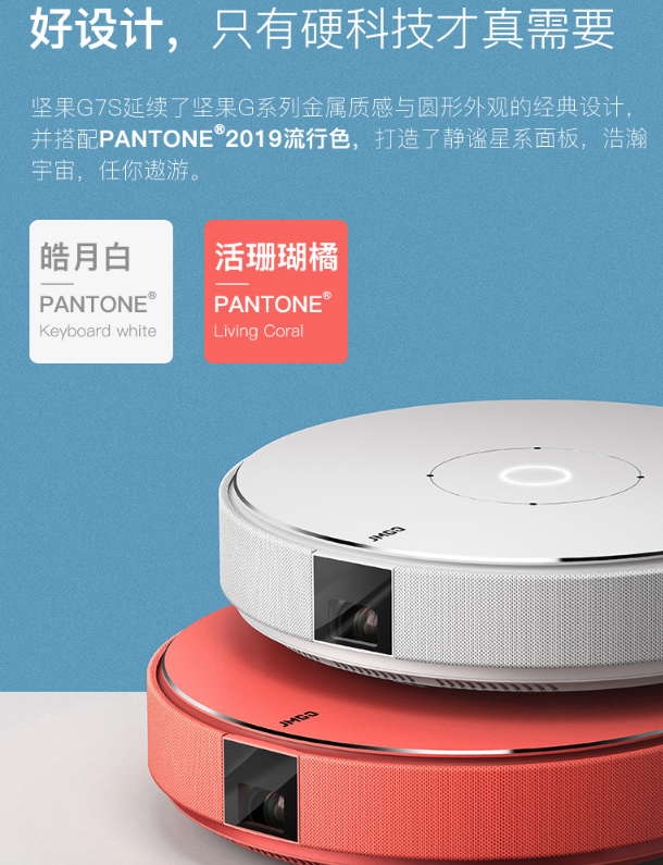 最后一台就是坚果G7S投影仪,坚果G7S采用了比较少见的圆盘设计,非常有科技感,并且提高了皓月白和活珊瑚橘两种颜色,在性能才G7同时是1080P的分辨率和700ANSI流明亮度,和极米Z6比较接近。不过坚果G7S使用了高通透玻璃镜头,所以在长时间使用的时候镜头不会因为受热而产生变形,引起虚焦,稳定性上更胜一筹。目前坚果G7S的售价基本在2699元左右。