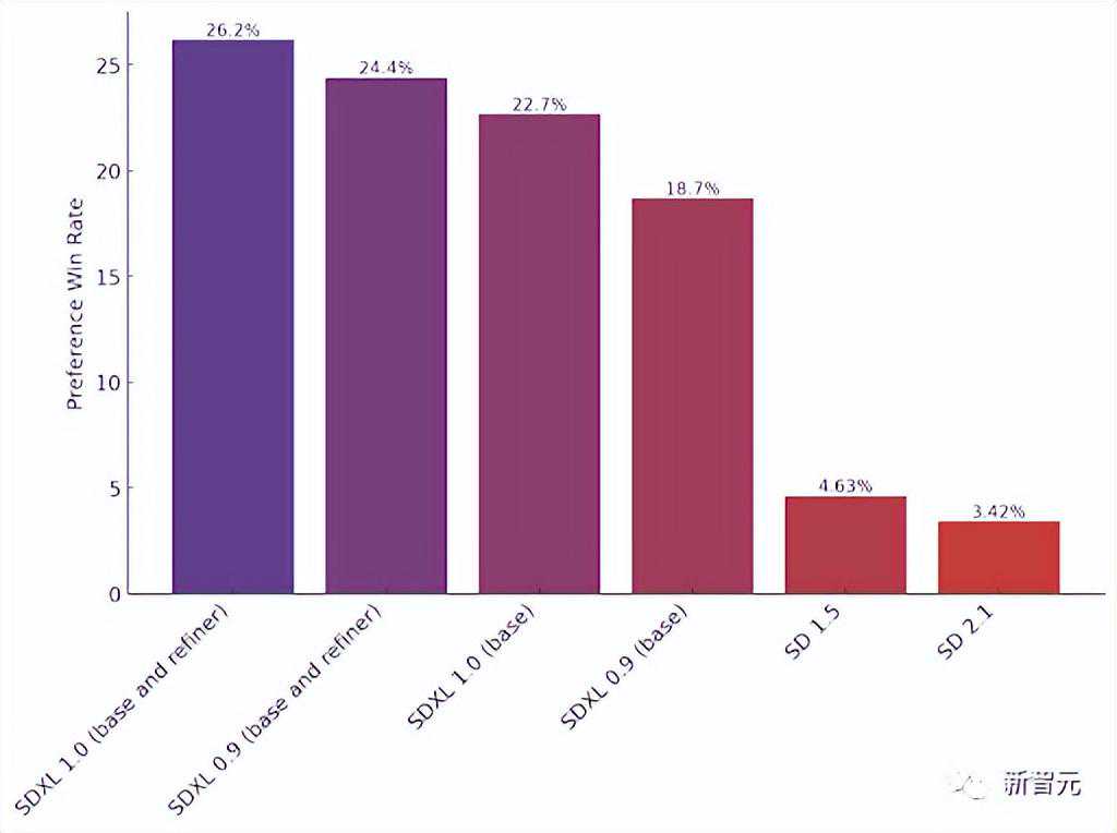 可以看到,上图中纵轴是偏好比例,横轴则是各代SDXL或SD模型。一个月前的0.9版本偏好率是24.4%,低于1.0新版26.2%的偏好。