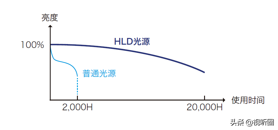 而由于采用的是HLD新光源,寿命长达20000小时,是普通光源寿命的10倍。再比如每天按最长使用8小时(很少有这样的使用频率)来计算,至少可以使用7年无需更换,且HLD光源呈线性衰减,平稳缓慢,无亮度急剧降低或突然黑屏风险。